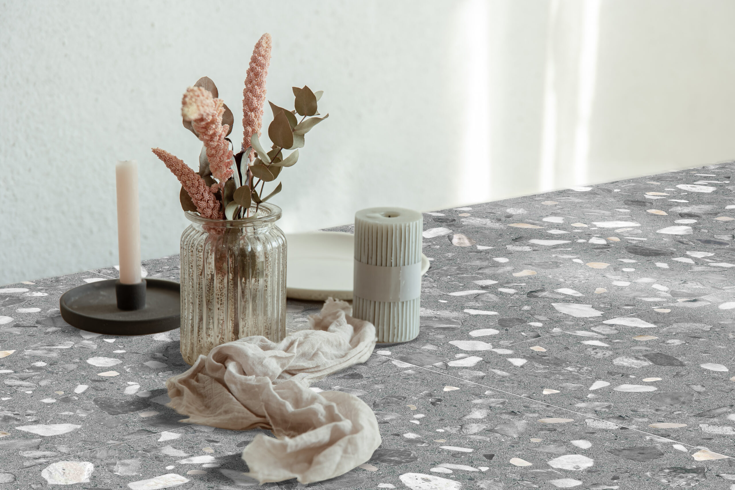 The timeless pattern of terrazzo design inspired by Italian artisanal tradition, presents in full-body porcelain stoneware for simple installation, easy cleaning and durability with minimal maintenance.